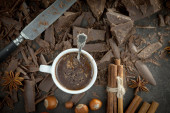 Ciemna czekolada w kompozycji z ziarnem kakaowym i orzechami, na starym tle.