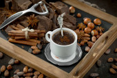Zdjęcie "Ciemna czekolada w kompozycji z ziarnem kakaowym i orzechami, na starym tle." może być wykorzystywane do celów osobistych i komercyjnych zgodnie z warunkami zakupionej licencji Royalty-free. Obraz jest dostępny do pobrania w jakości wysokiej rozdzielczości do 5760x3840.