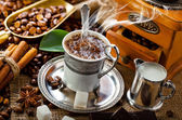 Ciemna czekolada w kompozycji z ziarnem kakaowym i orzechami, na starym tle.