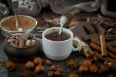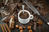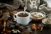 Ciemna czekolada w kompozycji z ziarnem kakaowym i orzechami, na starym tle.