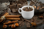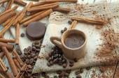 Kawałki ciemnej czekolady i ziarna kakao w składzie na starym tle