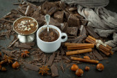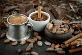 Kawałki ciemnej czekolady i ziarna kakao w składzie na starym tle