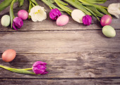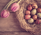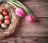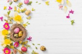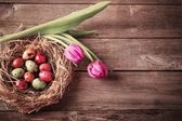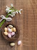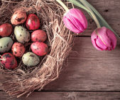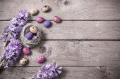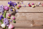 gniazdo jajko z kwiatami na rustykalne drewniane tła