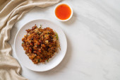 Zdjęcie "Tajskie jedzenie Smaż kurczaka i chili w oleju. Lokalne tajskie jedzenie można zjeść w restauracji. Główny składnik wykorzystuje smażonego kurczaka z chili na, czarne tło." może być wykorzystywane do celów osobistych i komercyjnych zgodnie z warunkami zakupionej licencji Royalty-free. Obraz jest dostępny do pobrania w jakości wysokiej rozdzielczości do 5760x3840.