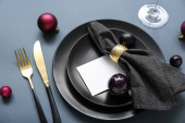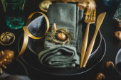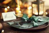 Zdjęcie "Świąteczne złote sztućce na talerzu z bombką i wstążką na ciemnym tle. " może być wykorzystywane do celów osobistych i komercyjnych zgodnie z warunkami zakupionej licencji Royalty-free. Obraz jest dostępny do pobrania w jakości wysokiej rozdzielczości do 5760x3840.