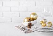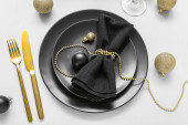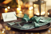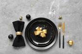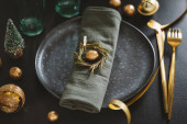 Świąteczne złote sztućce na talerzu z bombką i wstążką na ciemnym tle.