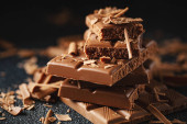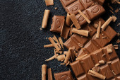 Zniszczone batoniki czekoladowe na ciemnym tle. Zbliżenie. Tło czekoladowe
