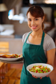 Pretty uśmiechnięta młoda Azjatka wprowadzenie kawałki owoców w blenderze do smoothie i procesu nagrywania na smartfonie