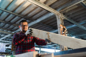 Poważny dojrzały cieśla wkładający drewnianą deskę do szlifierki bębnowej do obróbki drewna