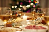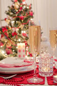 Mężczyzna wylewa szampana na flet, gdy jego żona dekoruje świąteczny stół