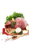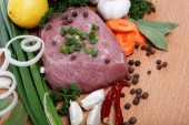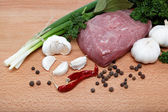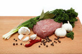 surowe mięso, warzywa i przyprawy na pokładzie cięcia drewna.