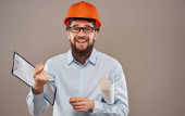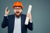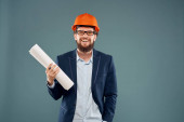 Wesoły człowiek z planami w rękach w pomarańczowym hełmie inżynier bezpieczeństwa przycięty widok