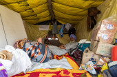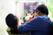 Phnom Penh, Phnom Penh / Kambodża - 5 października 2016: Zdjęcie ulicznego zakładu fryzjerskiego w Phnom Penh. Zapewniają również czyszczenie uszu. Czyściciel uszu z klientem.