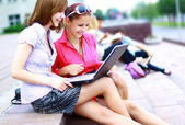 zbliżenie szczęśliwy młodych przyjaciół za pomocą laptopa
