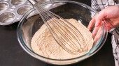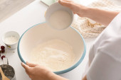 Bliskie zdjęcie dłoni młodej kobiety, która wkłada mąkę migdałową z kubka do miski ze stali nierdzewnej miksera.