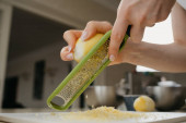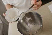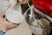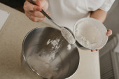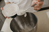 Bliskie zdjęcie spadającej mąki pszennej z łyżki w dłoni młodej kobiety do miski ze stali nierdzewnej mieszalnika.
