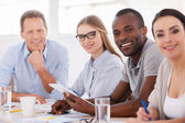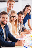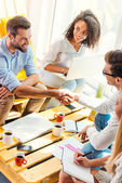 dyskusji na temat nowego projektu razem. Grupa ludzi biznesu wesoły siedzieli przy stole i dyskusji na temat coś