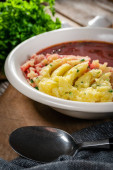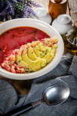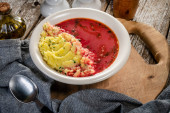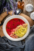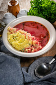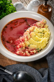 Zdjęcie "Czerwony barszcz podawany z tłuczonymi ziemniakami w misce." może być wykorzystywane do celów osobistych i komercyjnych zgodnie z warunkami zakupionej licencji Royalty-free. Obraz jest dostępny do pobrania w jakości wysokiej rozdzielczości do 5760x3840.