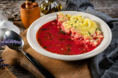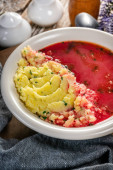 Czerwony barszcz podawany z tłuczonymi ziemniakami w misce.