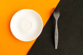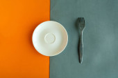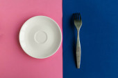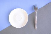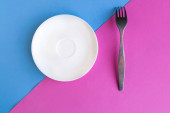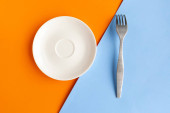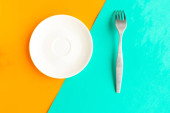 Pusty talerz i widelec na zielonym i niebieskim tle. Skopiuj miejsce na tekst. Koncepcja minimalna