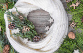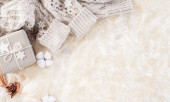 Piękny prezent świąteczny w opakowaniach rzemiosła. Styl życia w tle. Ręcznie robione płatki śniegu. Jasnobeżowe pastele. Koc na drutach. Nowy Rok. górny widok copyspace splash screen