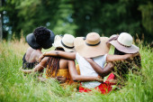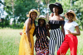 Zdjęcie "Grupa czterech wspaniałych afrykańskich kobiet nosi letni kapelusz skacząc na zielonej trawie w parku." może być wykorzystywane do celów osobistych i komercyjnych zgodnie z warunkami zakupionej licencji Royalty-free. Obraz jest dostępny do pobrania w jakości wysokiej rozdzielczości do 5760x3840.