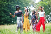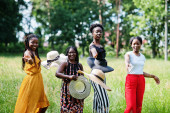 Zdjęcie "Grupa czterech wspaniałych afrykańskich kobiet nosi letni kapelusz spędzając czas na zielonej trawie w parku." może być wykorzystywane do celów osobistych i komercyjnych zgodnie z warunkami zakupionej licencji Royalty-free. Obraz jest dostępny do pobrania w jakości wysokiej rozdzielczości do 5760x3840.