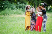 Grupa czterech wspaniałych afrykańskich kobiet nosi letni kapelusz spędzając czas na zielonej trawie w parku.