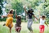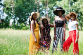 Zdjęcie "Grupa czterech wspaniałych afrykańskich kobiet nosi letni kapelusz spędzając czas na zielonej trawie w parku." może być wykorzystywane do celów osobistych i komercyjnych zgodnie z warunkami zakupionej licencji Royalty-free. Obraz jest dostępny do pobrania w jakości wysokiej rozdzielczości do 5760x3840.
