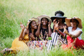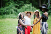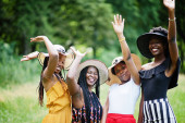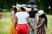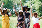 Grupa czterech wspaniałych afrykańskich kobiet nosi letni kapelusz spędzając czas na zielonej trawie w parku.