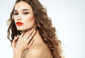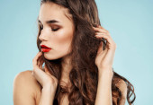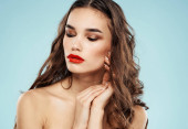 Zdjęcie "Elegancka brunetka modna fryzura jasny makijaż nagie ramiona zbliżenie niebieskie tło" może być wykorzystywane do celów osobistych i komercyjnych zgodnie z warunkami zakupionej licencji Royalty-free. Obraz jest dostępny do pobrania w jakości wysokiej rozdzielczości do 5760x3840.