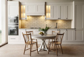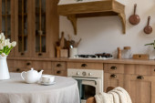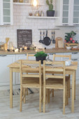 Concept of holiday breakfast. Vertical view of cozy kitchen in loft style interior with tablecloth, served plates and home decor on dining table near copy space wall, against cupboards furniture