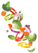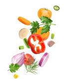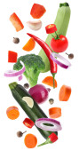 Zestaw różnych świeżych warzyw i przypraw spadających na białe tło