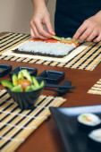 Zbliżenie kobieta kucharz cięcia japońskie sushi roll
