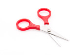 nowe nożyce z czarnym i czerwonym uchwytami z tworzywa sztucznego, na białym tle