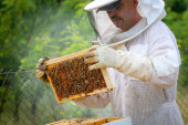 pilny pszczelarz w ochronnej ramie inspekcyjnej odzieży roboczej w pasiece