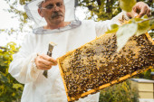 pszczelarz sprawdzający pszczoły miodne w ulu na plastrze miodu