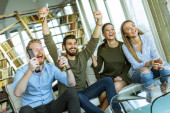 Grupa podekscytowanych ludzi biznesu świętuje i toasting z confetti spada w biurze