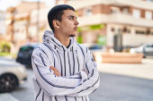 Student Kuwaiti człowiek nosić w bluzie, mówiąc przez telefon.