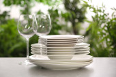 Zestaw czystych naczyń i kieliszków do wina na szarym stole na rozmytym tle