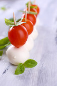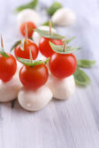 Świeże dojrzałe pomidory wiśniowe z kroplami wody i bazylią na stole, zbliżenie