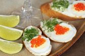 Czerwony kawior łososiowy w misce i kanapki z drewnianą deską do krojenia, szklanka z szampanem na niebieskim tle przestrzeń do kopiowania. Widok z góry.