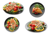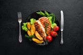 Pyszne kurczaka z grilla świeże warzywa i szpinak izolowane na białym, widok z góry