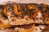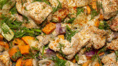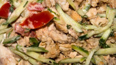 Smażone mięso z warzywami i ziołami.Tło plasterków mięsa z warzywami.