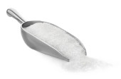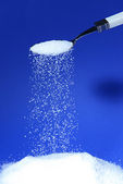 Wylewanie soli z shakera na niebieskim tle, zbliżenie