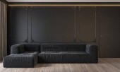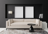 Czarne minimalistyczne wnętrze z marmurowym stołem do kawy i sofą.