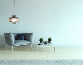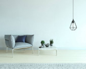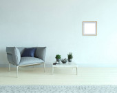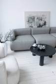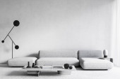 Nowoczesne minimalistyczne białe wnętrze z pomarańczową sofą i stołem kawowym.