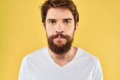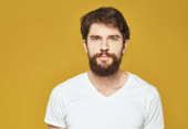 mężczyzna w białej koszulce gestykuluje rękami studio przycięte