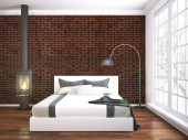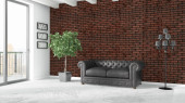 Loft wnętrze z sofą chester, ściana z cegły, panel, dywan i wystrój.