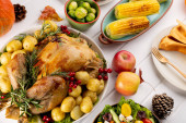 Tradycyjne Święto Dziękczynienia z pysznym gotowanym indykiem i innymi daniami sezonowymi serwowanymi na drewnianym stole